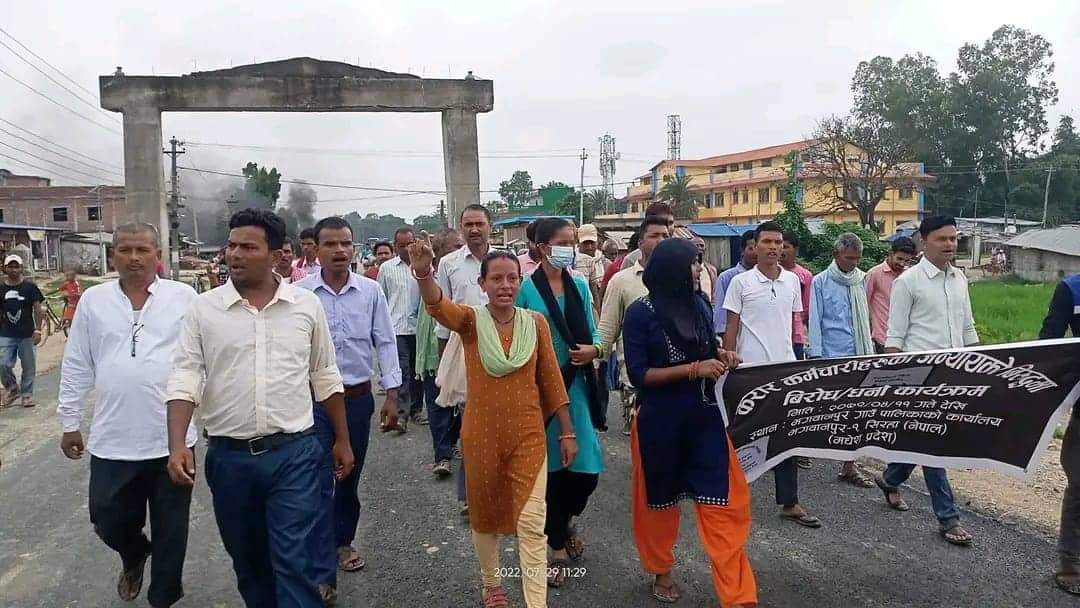 सिरहा ।सिरहाको भगवानपुर गाउँपालिकाबाट हटाइएको करार कर्मचारीहरुले पुनः बहालीको माग राखिदै मसला जुलुस पर्द्शन गरेका छन्।