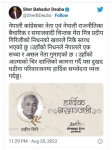 “नेपाली कांग्रेसका नेता एवं नेपाली राजनीतिका वैचारिक र समाजवादी चिन्तक मेरा मित्र प्रदीप गिरिजीको निधनको खबरले निकै स्तब्ध भएको छु । उहाँको निधनले नेपालले एक सच्चा र असल नेता गुमाएको छ । उहाँको आत्माको चिर शान्तिको कामना गर्दै यस दुःखद घडीमा परिवारजनमा हार्दिक समवेदना व्यक्त गर्दछु,” देउवाको ट्विटमा लेखिएको छ ।