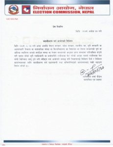असोज २३ गते भन्दा अगाडि नेपाल सरकार, प्रदेश सरकार, स्थानीय तह, कुनै सरकारी वा अर्धसरकारी निकाय वा सार्वजनिक संस्था वा विश्वविद्यालय वा विद्यालय वा नेपाल सरकारको पूर्ण वा आंशिक स्वामित्व भएको संगठित संस्था वा नेपाल सरकारको अनुदान प्राप्त संस्थामा पारिश्रमिक पाउने गरी बहाल रहेको व्यक्तिले राजिनामा दिएर निर्वाचनमा उम्मेदवारी दिएको भए त्यस्ता व्यक्तिको राजिनामा स्वीकृत गर्न आयोगले सम्बद्ध निकायलाई निर्देशन दिएको हो ।