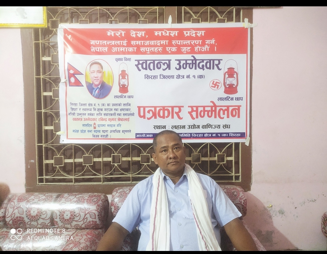 मंसिर ४ गते हुन् लागेको निर्वाचनमा सिरहा निर्वाचन क्षेत्र नम्बर १ क मा स्वतन्त्र उमेदवार रबिन्द्र श्रेष्ठको निकै चहलपहल रहेको छ्।स्वतन्त्र उमेदवार रबिन्द्र श्रेष्ठ करिब ३० बर्ष देखि नेपाली पत्रकारीता क्षेत्रमा रहेर काम गरि रहेका छन्।शिक्षामा स्नातकोत्तर र एलएलबी सम्मको अध्यन समेत गरेका उनले निरन्तर समाजसेवामा रहेका छन्। बहुप्रतिभा शालीन युवा श्रेष्ठले चुनावी प्रतिस्पर्धाका लागि निरन्तर घर्दैलो कार्यक्रममा सकृय रहेका छन्।लहानमा दल भन्दा निकै लोकप्रिय उमेदवारको रूपमा चिनिएका हुन्।