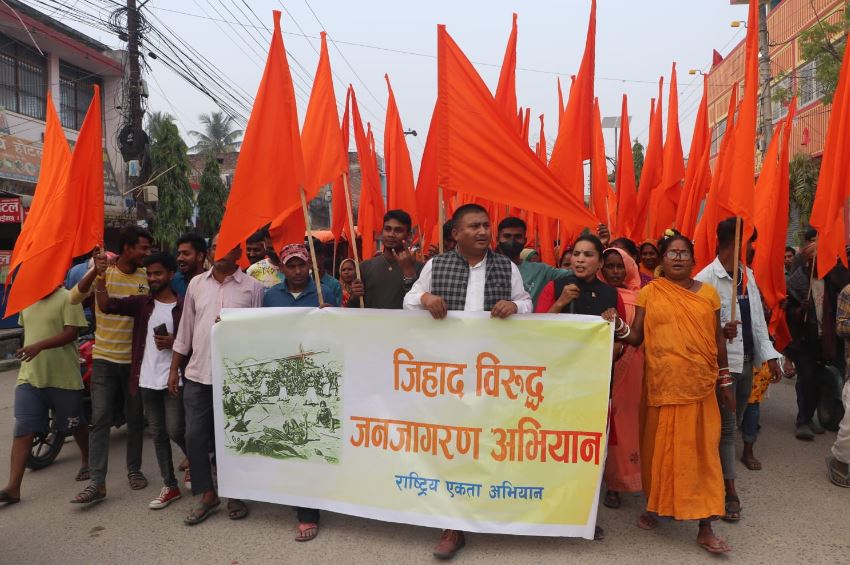 जिहादको नाममा नेपाली चेलीहरुको अपहरण भईरहेको बताउँदै गौ हत्या, गौ तस्करी, मठमन्दिर अतिक्रमण भइरहेकाे उनले बताए ।
