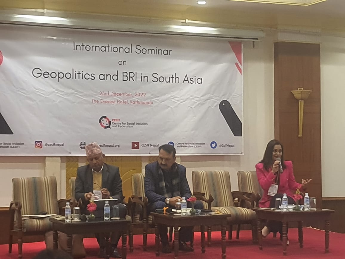नेकपा एमालेका उपमहासचिव तथा पुर्ब परराष्ट्रमन्त्री प्रदीप ज्ञवाली र नेपाली काङ्ग्रेसका प्रवक्ता एवम पुर्वपरराष्ट्र मन्त्री प्रकाश महतले आज शुक्रबार ‘सेन्टर फर सोसीइयल इन्क्लुजन एण्ड फेडेरसन’ आयोजना गरेको ‘जियोपोल्टिक्स एण्ड बिआरआई इन साउथ एसीया’ विषयको छलफल कार्यक्रममा बोल्दै सो धारणा राखेका हुन।