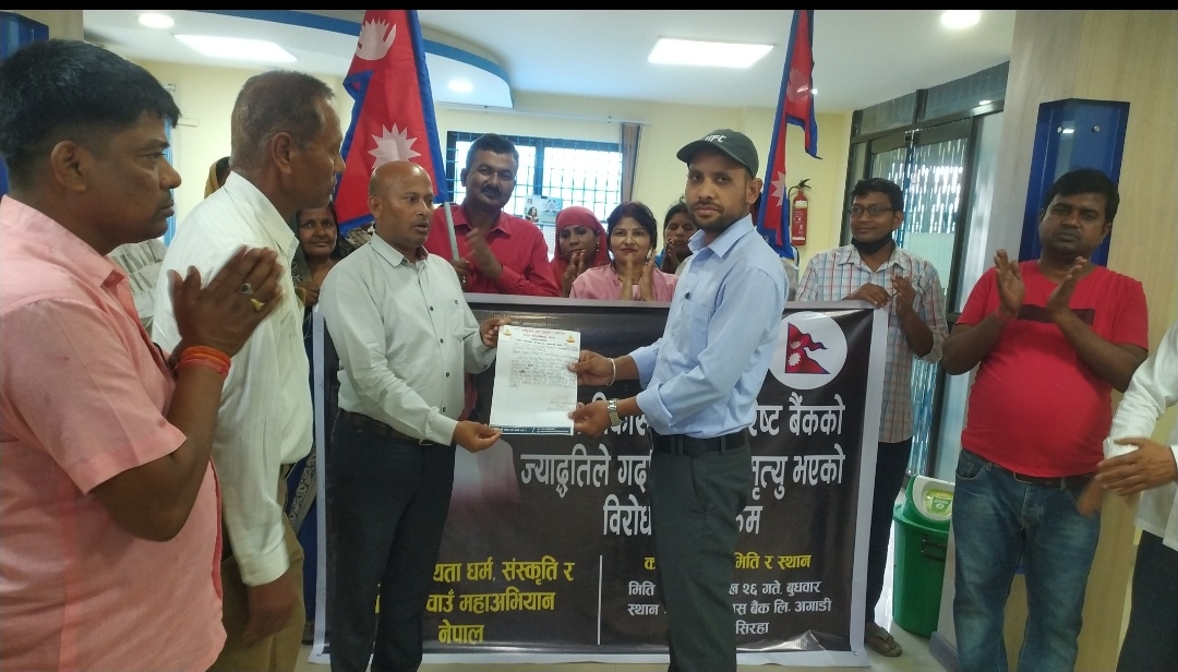 बैंकको ऋण समयमा तिर्न नसकिदा ज्योति बिकास बैंक लिमिटेड र एभरेष्ट बैठक लिमिटेडले ऋण चुक्ता गर्न दिएको मानसिक तनाव यातनाले आत्म हत्या गरी ज्यान गुमाएका चौधरीको सम्पुर्ण ऋण मिनाहा हुनुपर्ने र परिवारलाई भर्न पोषणको माग राखदै बुधबार देशै भरी ज्योति बिकास बैंक र एभरेष्ट बैंकको शाखा कार्यालयहरुमा दुर्गा प्रसाईं नेतृत्वको नागरिक बचाउ महाअधियानका मध्यमा अंचल प्रमुख नरेश कुमार साह,