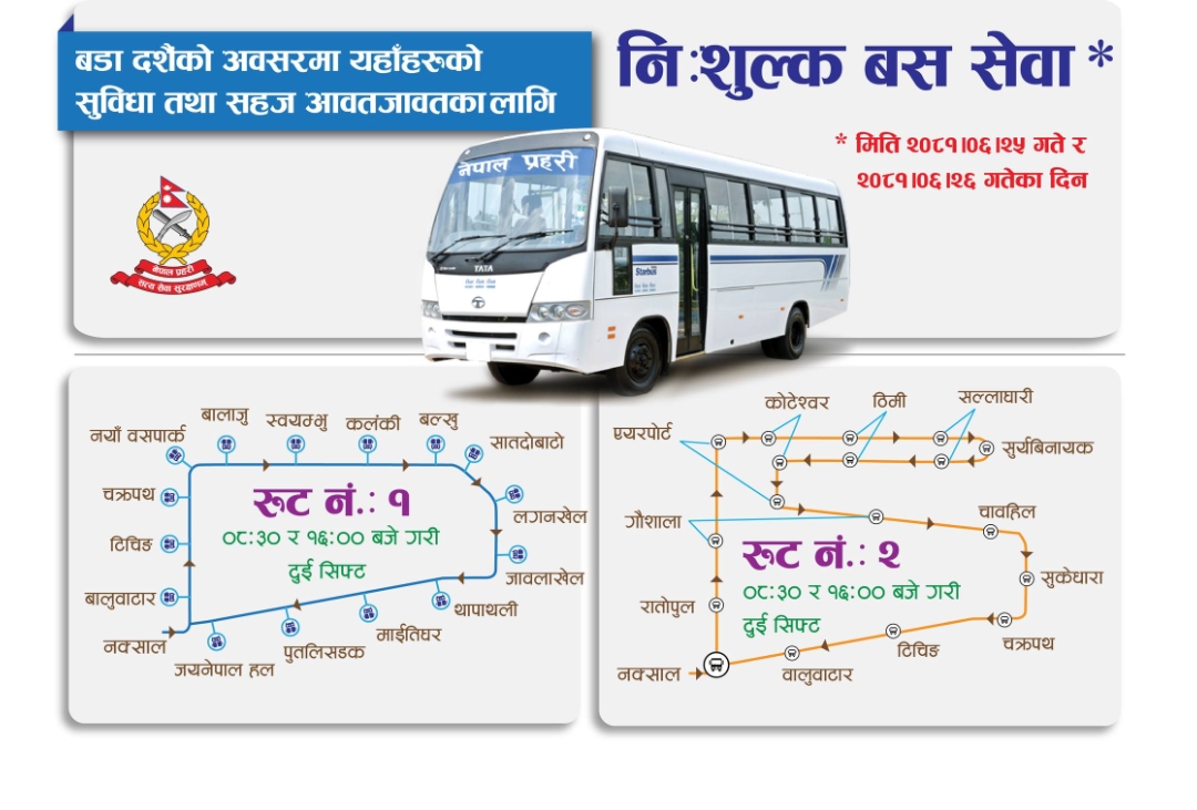 काठमाडौँ । काठमाडौं उपत्यकामा आज विजयादशमीको अवसरमा नेपाल प्रहरीले निःशुल्क बस सेवा सञ्चालन गरेको छ। सार्वजनिक यातायात न्यून चल्ने भएकाले नागरिकलाई टीका थाप्न र अन्य अत्यावश्यक कामका लागि सहज आवतजावत होस् भन्ने उद्देश्यले यो व्यवस्था गरिएको हो।