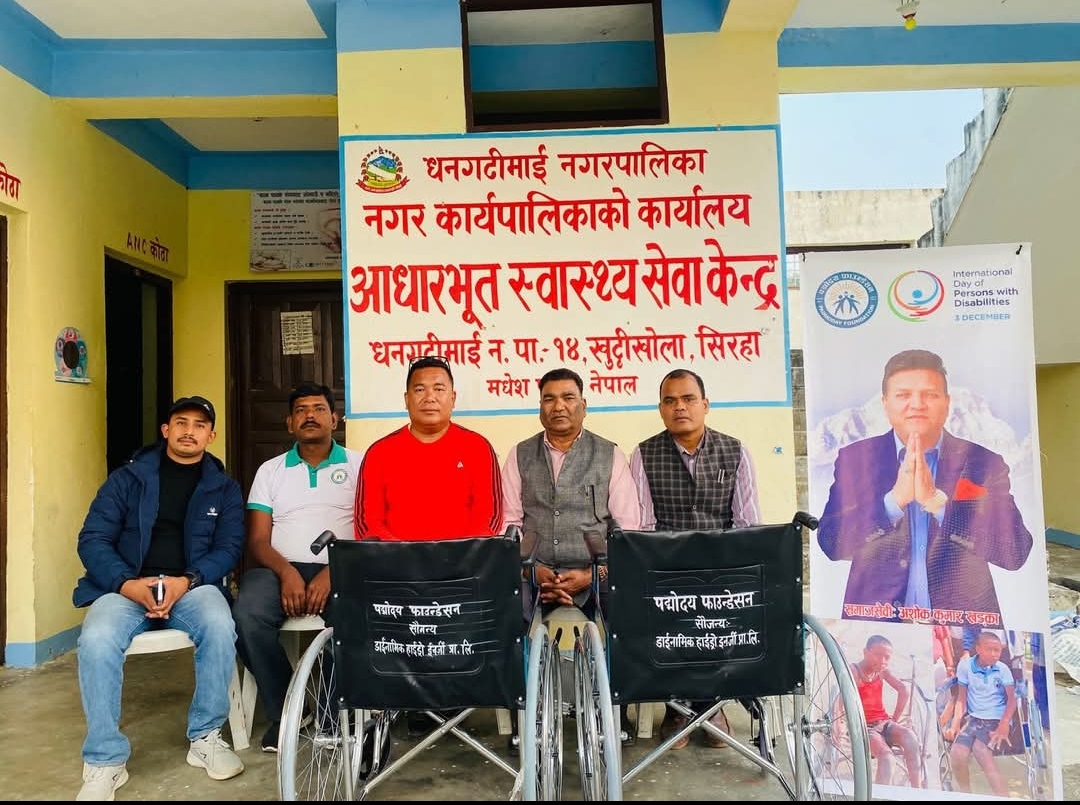 सिरहाको धनगढीमाई नगरपालिकाको तरकारी बजारमा मङ्गलबार आयोजित कार्यक्रममा फाउन्डेसनले अपाङ्गता भएका व्यक्तिहरूको सम्मान,क्षमता विकास,र सामाजिक सहभागिताको सन्देश फैलाउने उद्देश्यले व्हीलचेयर वितरण गरेको हो।
