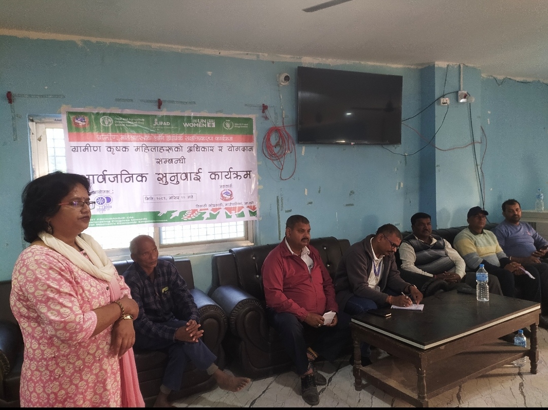 सिरहा लहान २०मंसिर – ग्रामीण महिलाहरूको आर्थिक सशक्तिकरण र उनीहरूको अधिकारको पहिचानलाई अघि बढाउन संयुक्त राष्ट्रसंघीय निकायहरूको सहकार्यमा सप्तरी जिल्लाको तिलाठी कोइलाडी गाउँपालिकामा एकदिने सार्वजनिक सुनुवाइ कार्यक्रम सम्पन्न भएको छ। दिदीबहिनी नामक संस्थाको आयोजनामा भएको कार्यक्रममा करिब ५० जना ग्रामीण महिला कृषकहरूको सहभागिता रहेको जानकारी आयोजक संस्थाकी प्रतिनिधि अनु पोखरेलले दिइन्।