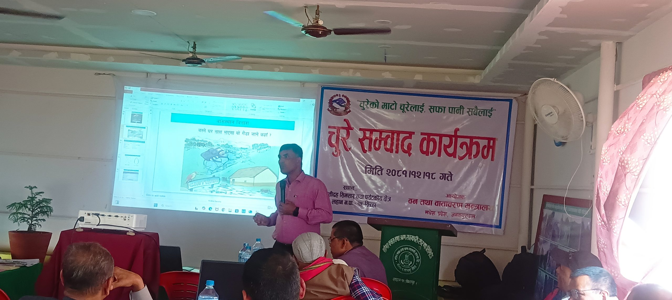 त्यसैगरि डिभिजन वन कार्यालय धनुषाका प्रमुख विनोद सिंहले चुरेको अवस्था र यसको संरक्षण तथा व्यवस्थापनका लागि हालसम्म गरिएका कार्यक्रमहरुको प्रगतिको अवस्था बारेमा ‘पावरपोइन्ट’ प्रस्तुतिकरण गर्नुभएको थियो ।