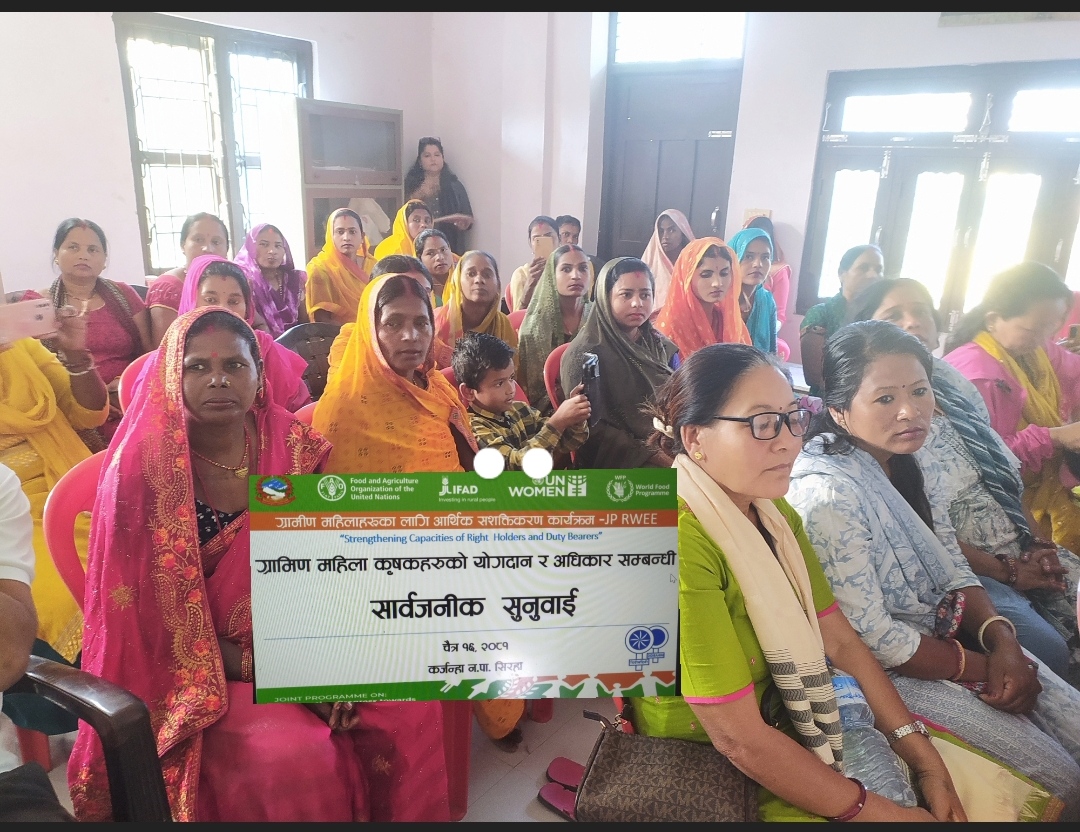 महेश सिंह लहान – ग्रामीण महिलाहरूको आर्थिक सशक्तिकरण र उनीहरूको अधिकारको पहिचानलाई अघि बढाउन संयुक्त राष्ट्रसंघीय निकायहरूको सहकार्यमा सिरहाको कर्जन्हा नगरपालीकाको बन्दिपुरमा एकदिने सार्वजनिक सुनुवाइ कार्यक्रम सम्पन्न भएको छ। दिदीबहिनी नामक संस्थाको आयोजनामा भएको कार्यक्रममा करिब ५५ जना ग्रामीण महिला कृषकहरूको सहभागिता रहेको दिदीबहिनीका परियोजना अधिकृत बिपिन आर्यालले जानकारी दिनु भयो ।