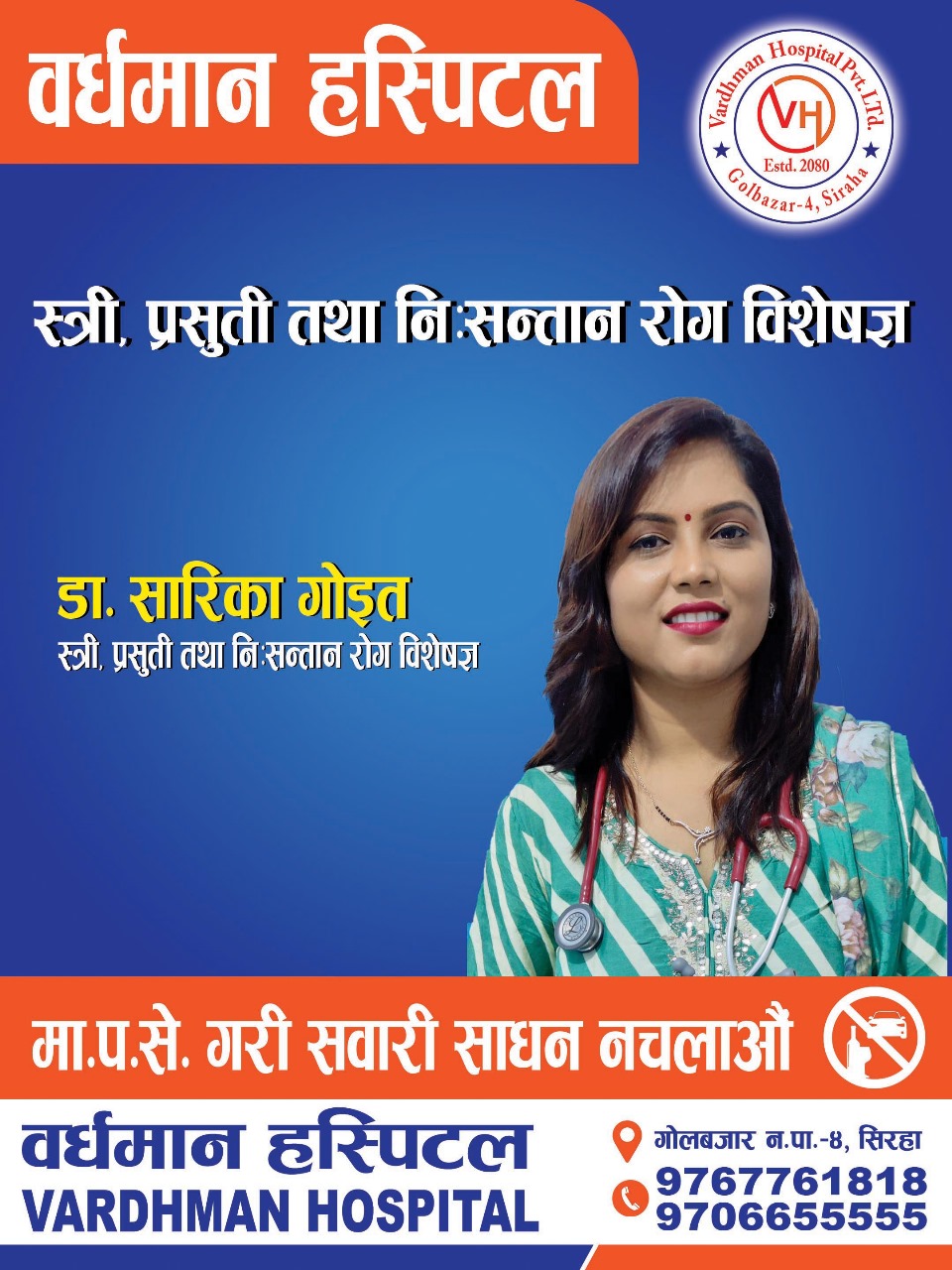 लहान।हिन्दुहरूको महान चाड विजयादशमी, शुभ दीपावली तथा छठ पर्वको पावन अवसरमा स्त्री, प्रसूति तथा निःसन्तान रोग विशेषज्ञ डा. सारिका गोइतको तर्फबाट सम्पूर्ण नेपाली दाजु–भाइ तथा दिदी–बहिनीहरूमा सुस्वास्थ्य, दीर्घायु र समृद्धिको लागि हार्दिक मंगलमय शुभकामना व्यक्त गरिएको छ।