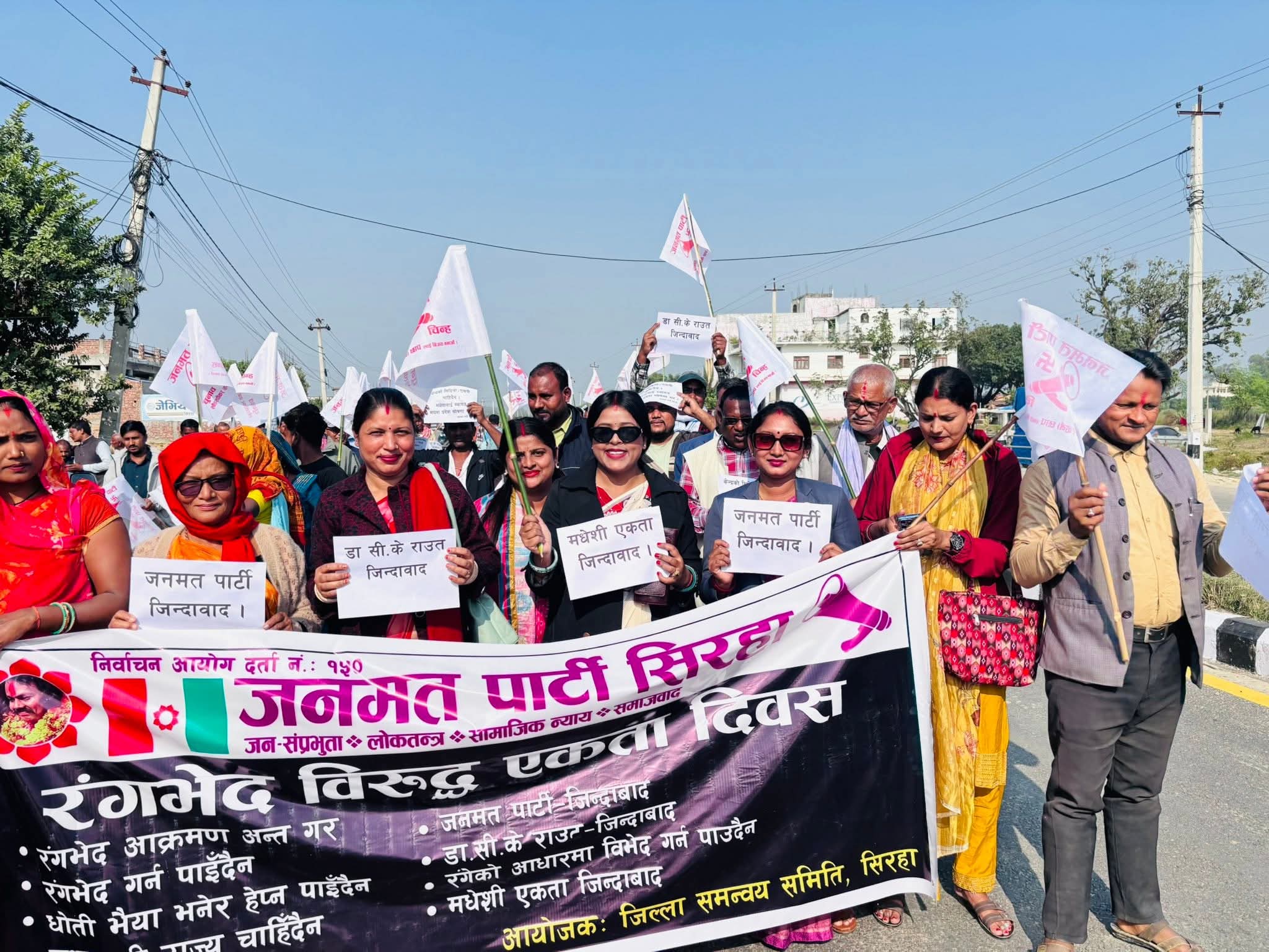 महेश सिंह लहान सिरहा –डा.सिके राउत नेतृत्वको जनमत पार्टी जिल्ला कार्य समिति सिरहाले मंसिर १० गते रंगभेद विरोधी एकता दिवस भव्य र उत्साहपूर्ण माहोलमा मनाएको छ। प्रदेशभरबाट आएका हजारौँ नेता तथा कार्यकर्ताहरूको उपस्थितिमा कार्यक्रम सम्पन्न भएको खुशबु जेस्वालले जानकारी दिएकी छन्।